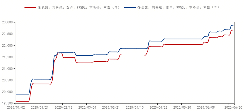 供应端蛋氨酸多数企业发布国内外工厂上半年检修计划,安迪苏(600299)4-5月已经完成检修,赢创、新和成(002001)、紫光在三季度均有检修计划,保持关注。据海关数据显示,2025年1-5月蛋氨酸出口总量132559.848吨,同比增6.56%,国内生产企业基本保持满产生产,在出口大增且企业未来存检修背景下,国内外中下游企业担忧未来供应偏紧,中下游企业询单量增加明显,饲料企业库存逐渐累库,市场价格上涨明显,上半年蛋氨酸均价21588.62元/吨,环比上涨5.3%,同比下降1.17%。